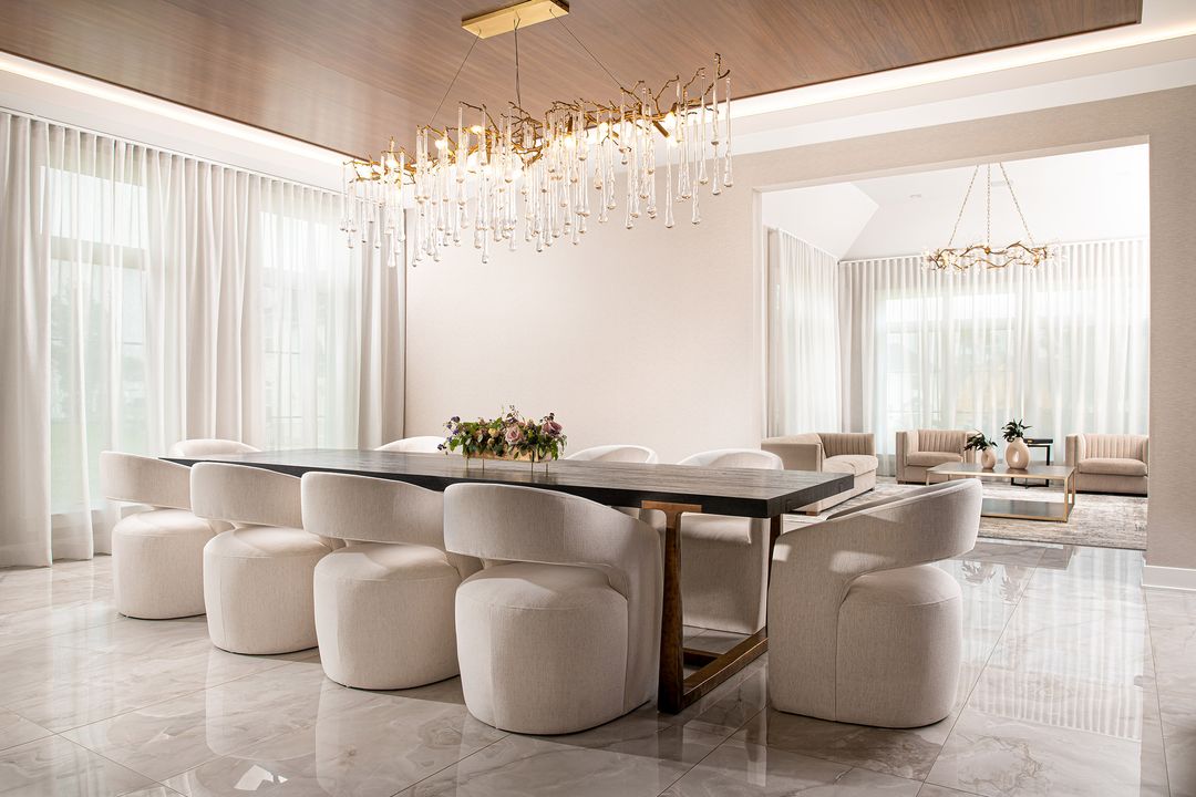 The entry foyer sets the tone with custom millwork, a refined palette of greys and warm neutrals, and layered lighting that complements the home’s proportions. Transitions between rooms are seamless, guided by consistent detailing and a clear design language.